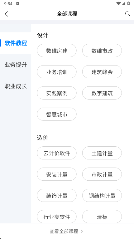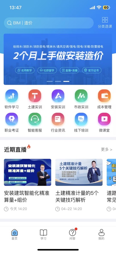 3、点开分类课程,造价软件基础、造价实务、施工管理、职业考试等,还有精彩的直播课程、免费课程;