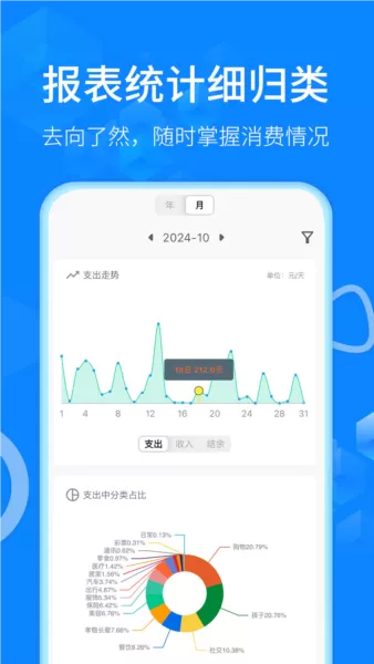 支持1级分类、2级分类各种报表统计,轻松知道钱的去向,及时修正消费习惯。