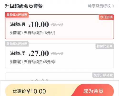 会员的价格的话就是10元/月(连续包月),27元/季(连续包月),108元/年(连续包月),18元/月,50元/季,198元/年。当然连续包月是更加划算的,但是连续包月有的时候会忘记。