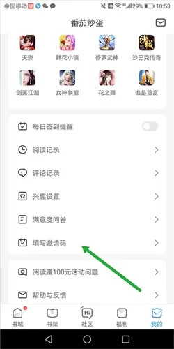 因为在使用米读极速版的时候,会有一些获得奖励的方法,其实邀请好友软件,也是一个活动的任务,咱们可以获得的奖励也还是挺多的,所以如果说你们邀请了你们的好友的话,他们应该在什么地方填写邀请码呢?首先肯定是需要打开软件,然后点击最下面一行的【我的】,然后我们就把页面往下拉,看到了【填写邀请码】。点击进入之后,你们就可以直接把对方的邀请码填入进去就可以了。