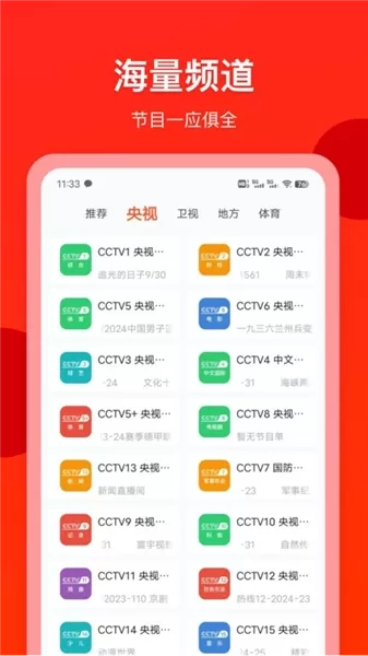 覆盖央视、卫视、地方台等各类频道,全方位满足用户多样化的观看需求。无论用户想看新闻资讯、综艺娱乐,亦或是体育赛事,都可在该App中找到对应的直播内容。
