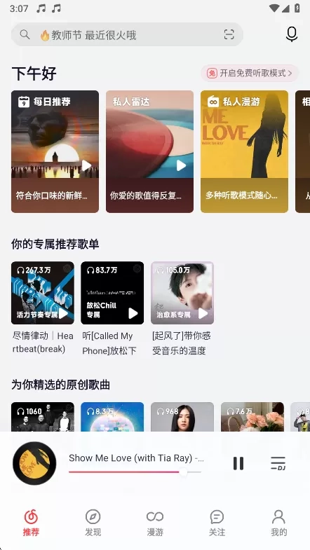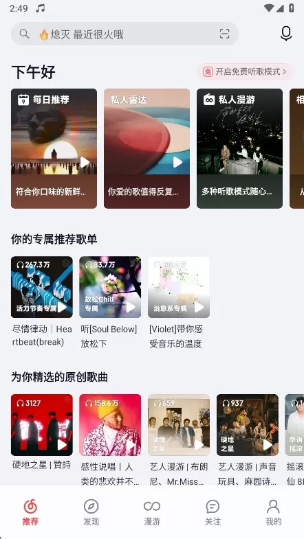 1、在本站下载安装荣耀音乐并打开,进入首页后,即可浏览到推荐的音乐。