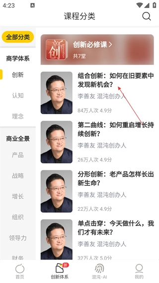 3、在课程分类页面,选择感兴趣的课程条目,如【组合创新:如何在旧要素中发现新机会】。