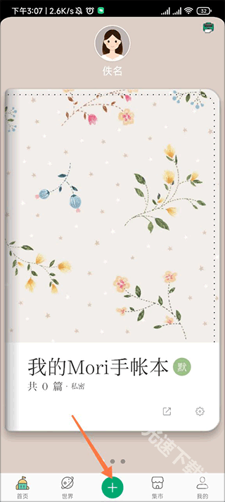 第一步,打开Mori手账,接着在界面底部中央位置,寻找到标有【+】的图标,点击该图标进入。