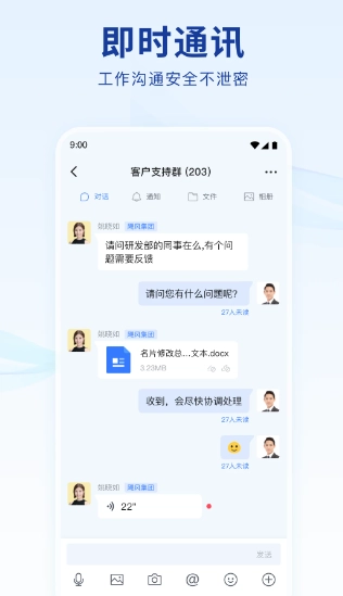 2、无论是私聊、群聊,还是广播号、订阅号,亦或是智能机器人,多样的对话类型全方位满足你工作所需。
