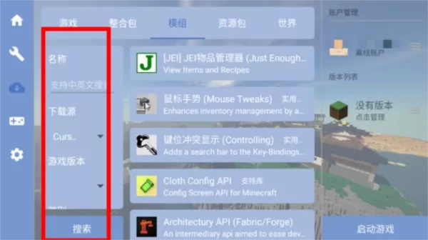 2、模组也是如此,支持中文和英文搜索,能够依据源、游戏版本、类型等条件进行筛选。