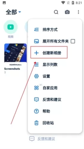 2、接着就会弹出很多的功能,我们只需点击【创建新相册】;