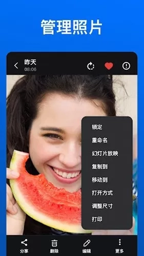 5.你可以对照片进行重命名、分享或删除操作。