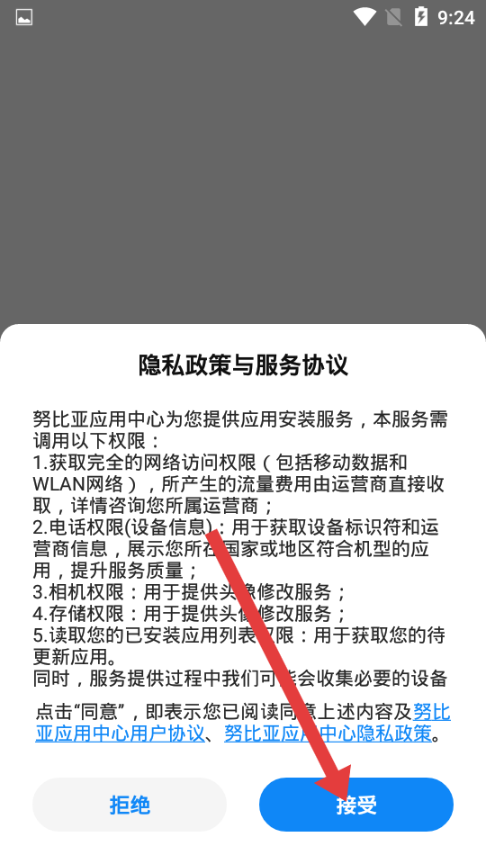 首次打开,阅读《隐私政策与服务协议》后点击“接受”,进入应用。