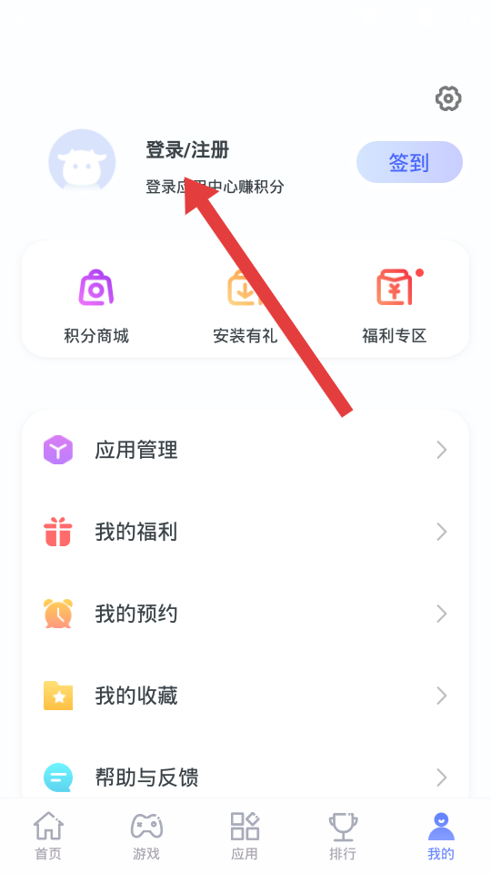 2、在“我的”页面中找到登录注册选项并点击,此入口能够引导您进入账号登录流程。成功登录后,您即可享受赚积分、使用积分商城等专属服务,同时还能整合您在应用商店的相关权益与功能。