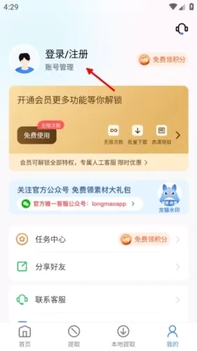 进入个人信息页面后点击最上方的“登录/注册”。