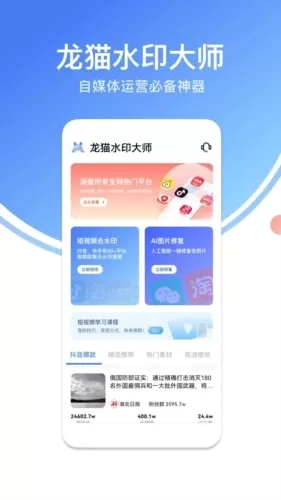 龙猫水印大师支持全网各大应用平台的视频、图片无水印提取,将喜欢的视频直接将链接复制就可以去水印保存了,同时每一个提取的视频还都是高清的!内还提供有时下热门的海量素材,无损音乐、绿幕特效、文字特效、高清壁纸自由挑选,感兴趣的用户欢迎前来吧!