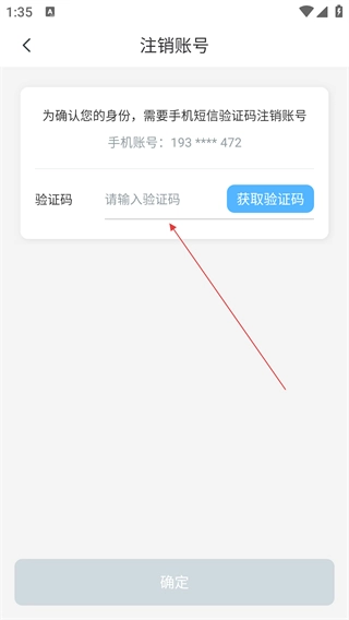 4、在注销页面,点击【获取验证码】,输入收到的验证码后,点击【确定】完成账号注销。