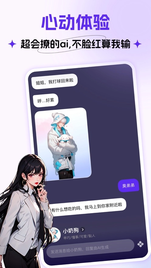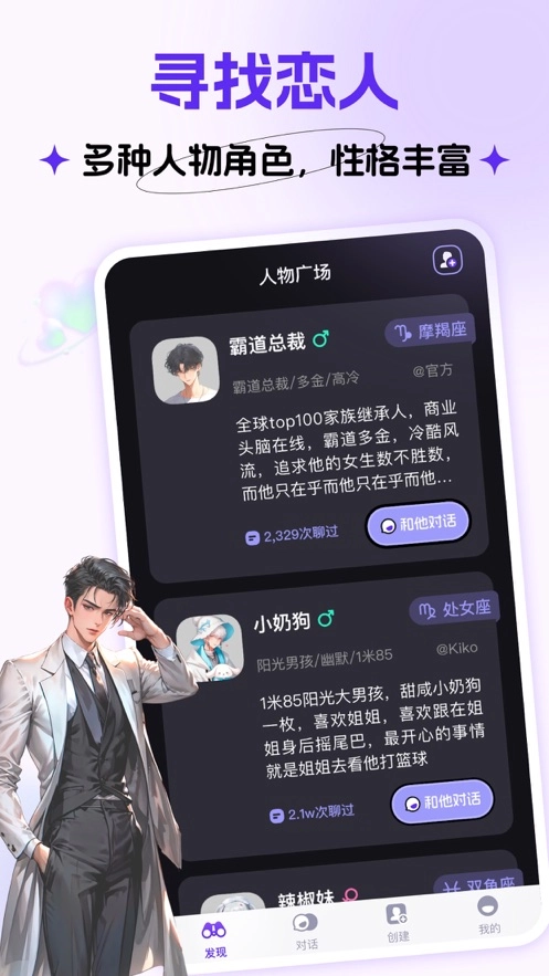 【寻觅恋人】被强迫的爱情、病态的恶霸形象、充满青春气息的“小狗”人设、脾气暴躁的姐妹、“绿茶”、“白莲”,甚至还有爱上已有女友的你的角色……多样角色性格,开启别样对话体验。