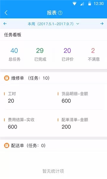 6、报表统计了所有的任务信息,划分了任务看板、维修单以及配送单栏,每一个栏展示详细的分类与内容;