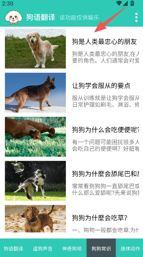2、在狗狗常识板块,查看“狗是人类最忠心的朋友”等内容。