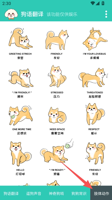 3、点击“肢体动作”,了解狗狗不同姿态的含义。