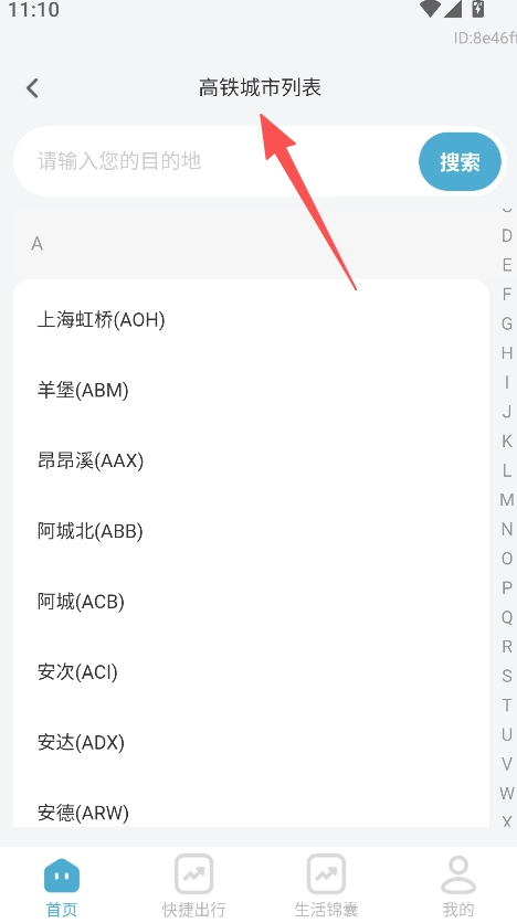 1、打开进入高铁城市列表,可搜索目的地。