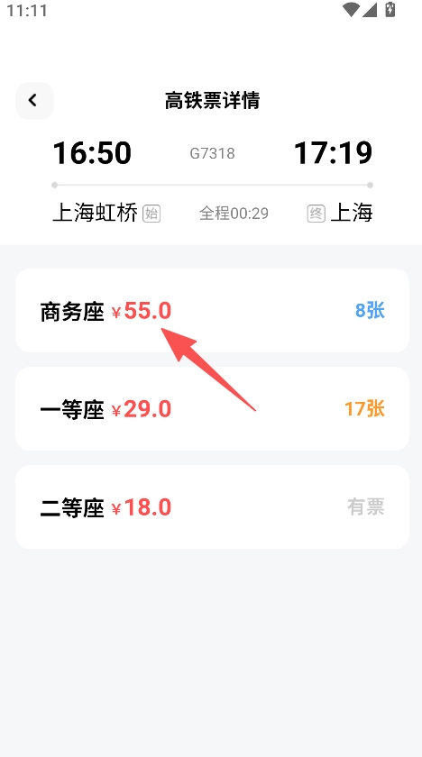 2、查看高铁票详细信息,知悉商务座、一等座、二等座的票价及剩余票数。
