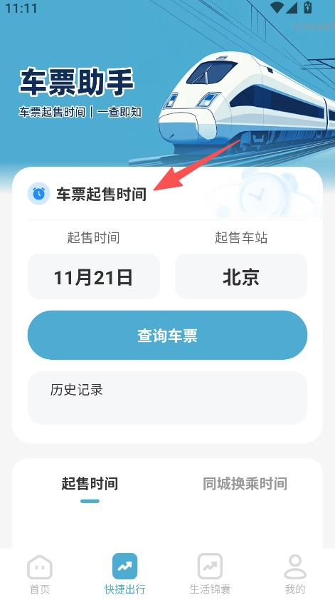 3、点开快捷出行板块,查找车票起售时间,精准把握购票时机。