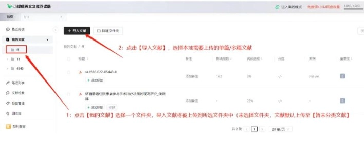 1、打开后,点击【导入文献】按钮,选择需要导入的PDF或CAJ格式文件即可完成文献导入。