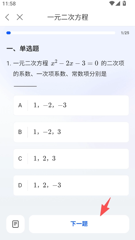 3、点击章节进入练习页面,完成题目后点击下一题。