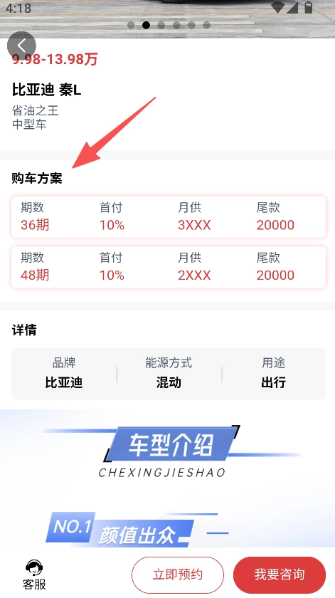 3、在车型详情页查看购车方案,了解首付月供等信息。