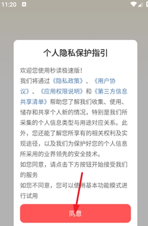 1、第一步是打开秒读极速版应用,然后阅读并同意个人隐私相关内容。