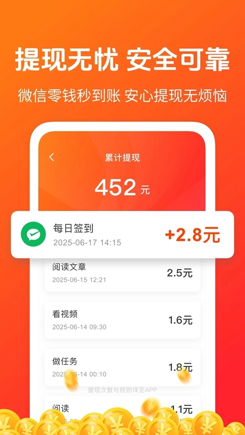 阅读赚取收益:通过浏览资讯、完成每日任务可直接获得现金红包与金币奖励,支持低门槛提现至微信零钱