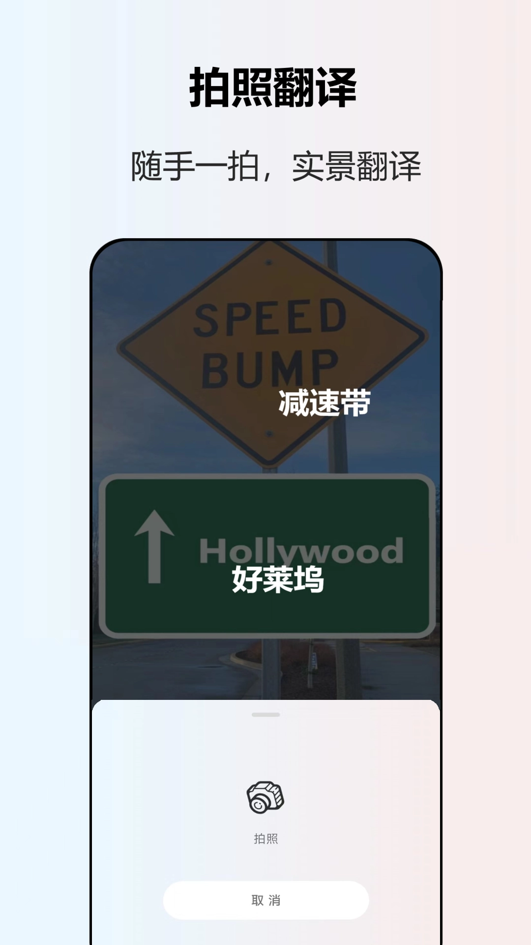 点击拍照翻译的操作步骤是:点击相机图标进行拍照,App会利用OCR技术对文字加以识别并完成翻译,同时支持实时取词功能。
