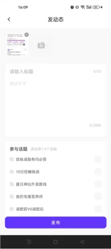 3、进入编辑页面,输入标题以及内容,选择参加话题,点击“发布”选项即可。