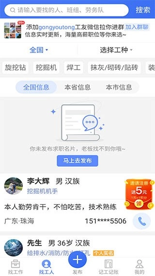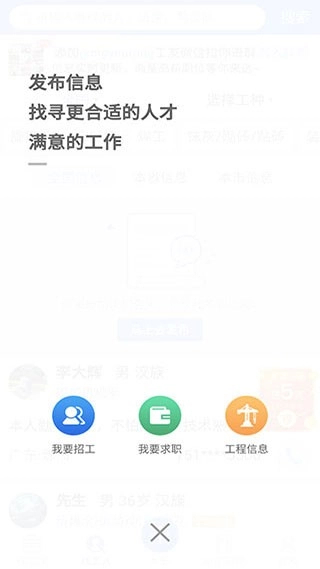 【发布】页面主要包含三大功能模块:我要招工、我要求职和工程信息。你可以在此发布相关信息,主动开展寻找与对接。