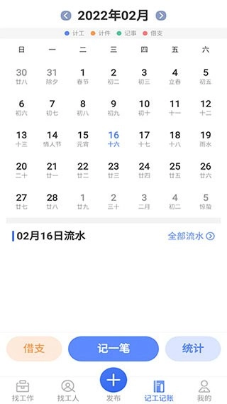 【记工记账】页面的核心功能是借助日历形式向用户呈现工作情况,用户能够在这里记录每一天的工作内容。