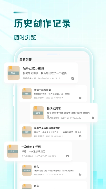 文章作文生成器,这款写作辅助应用能助力用户提升文字表达能力,提供了从快速成文、智能延展内容到创意文案、故事创作乃至传统联句生成等多样化功能。平台丰富的写作素材库供用户灵活选用,作品完成后还可进行线上自动校验,所有创作历程都能随时追溯查看,让每个人都能便捷地产出优质文章,不妨一试!