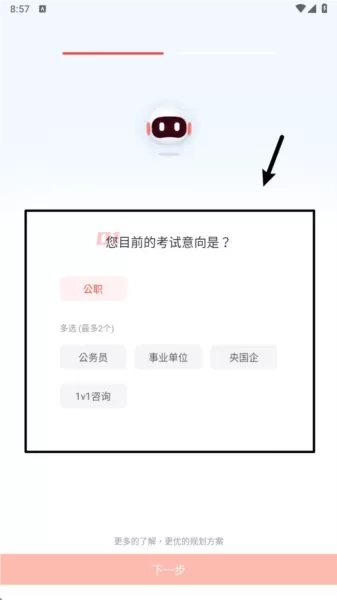 2. 登录成功后系统会引导填写考试意向,可多选公务员、事业单位等类型作为学习目标。