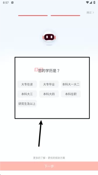 3. 接着选择当前学历阶段,例如“本科在读”或“研究生及以上”等,用于生成个性化学习方案。