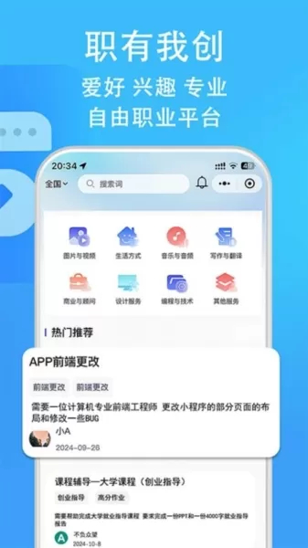 职有我创是一款自由职业者,每个人可以通过兴趣、爱好和专业来成为一名自由职业者,从而获得报酬。任何符合法律规定的技能您都可以在上去展示它,同时您也可以在职有我创享受到创造性的服务。