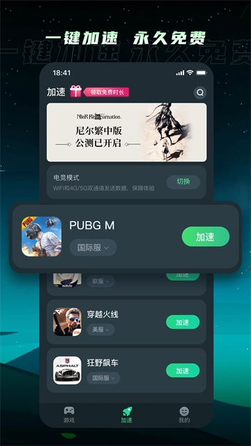 进入【加速】界面后,我们能够挑选加速模式,还可以添加本地游戏来进行加速。