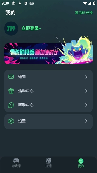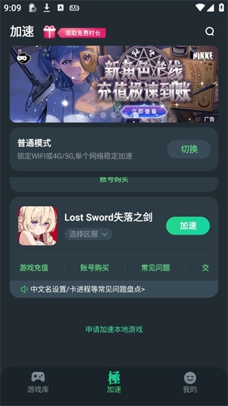 进入加速器界面后,能看到包含【游戏库】、【加速】与【我的】在内的几个栏目。