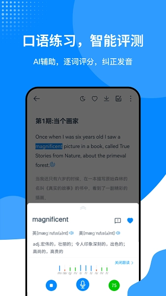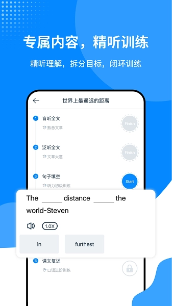 1、智能推荐:根据用户的水平和学习进度,智能推送合适的听力材料。