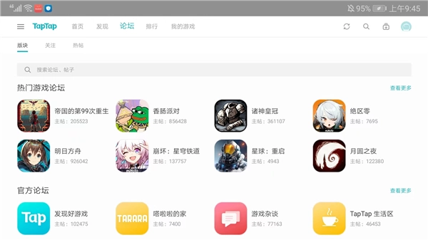 5、进入【论坛】界面,这里包含热门游戏论坛、综合论坛以及个人论坛等不同类型的板块,玩家能够在此进行交流与分享。