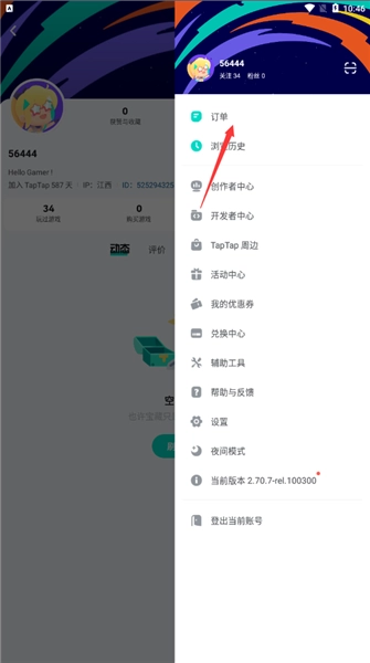 9、点击左上角的【三条杠】图标,能够打开菜单栏,里面包含关注、收藏、订单以及相关设置等功能,以上就是TapTap HD版的使用方法。