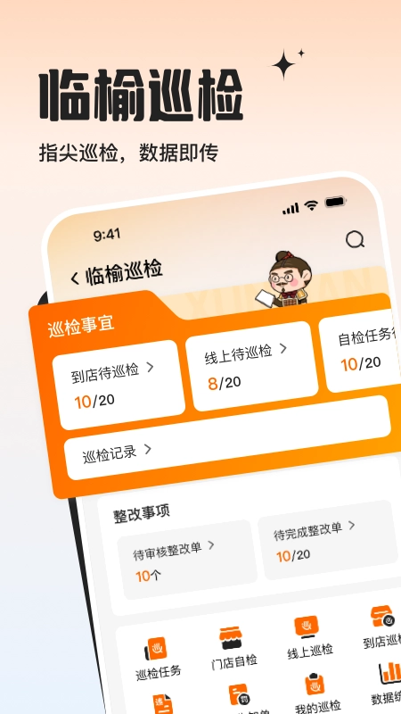 1、支持到店巡检与线上巡检两种模式,可记录任务详情、整改事项,实时跟踪巡检完成进度。