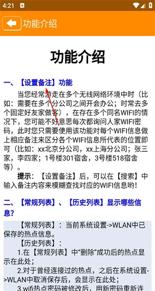 在功能介绍页面查看设置备注功能的说明,了解该功能在多个同名WiFi环境中区分位置的作用。