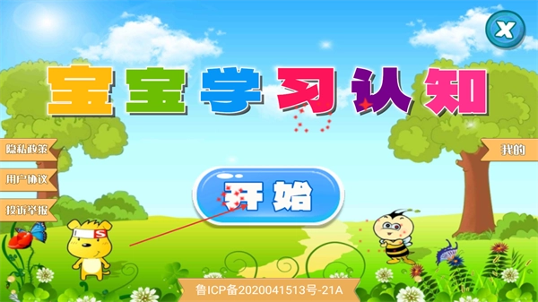 打开软件后,会呈现出【宝宝学习认知】的界面,在该界面中找到蓝色的【开始】按钮,点击此按钮就能进入功能选择页面。