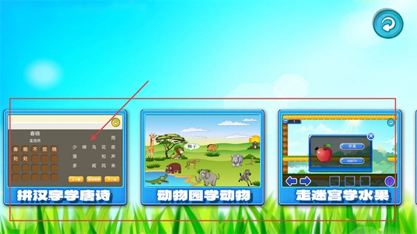 进入功能页面后,设有【拼汉字学唐诗】【动物园学动物】【走迷宫学水果】三个功能选项,您可根据自身需求选择对应的功能来开启学习之旅。