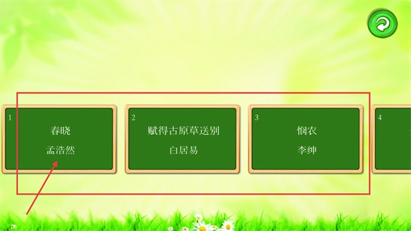 当选择【拼汉字学唐诗】这个选项后,会跳转至诗词选择页面,在该页面中能看到【春晓-孟浩然】【赋得古原草送别-白居易】等不同的诗词选项,点击相应的诗词选项即可进入对应的学习环节。