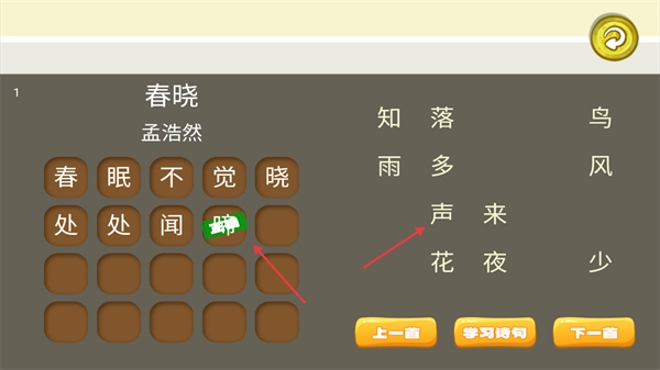 进入【春晓】学习页面后,右侧会显示一些零散的字词,需要把这些字词对应填到左侧的空缺位置里,填完之后就能通过【上一首】和【下一首】按钮来切换不同的诗词了。