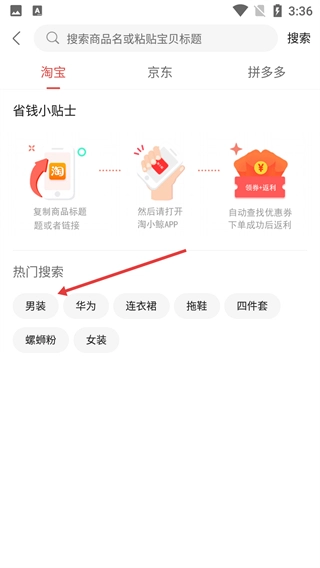 在搜索页面点击热门搜索里的【男装】选项,就能进入男装商品的列表页面。