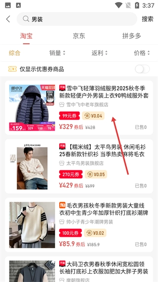 在男装商品列表页面挑选自己喜欢的商品(例如雪中飞轻薄羽绒服),然后点击进入该商品的详情页面。